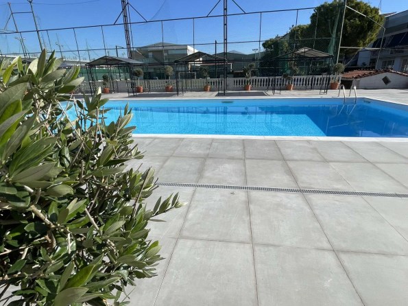 • Περιβάλλοντα χώρο 600 τ.μ. με πισίνα (8μ. x 20μ.), κατάλληλη για δεξιώσεις και εκδηλώσεις παντός τύπου. Η πισίνα βρίσκεται σε άριστη κατάσταση και δύναται να χρησιμοποιηθεί για τη λειτουργία Pool Bar με δυνατότητα εξυπηρέτησης 150 ατόμων. Ο χώρος διαθέτει ξαπλώστρες και τραπεζοκαθίσματα σε άριστη κατάσταση.