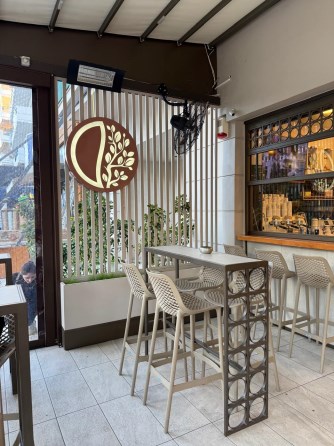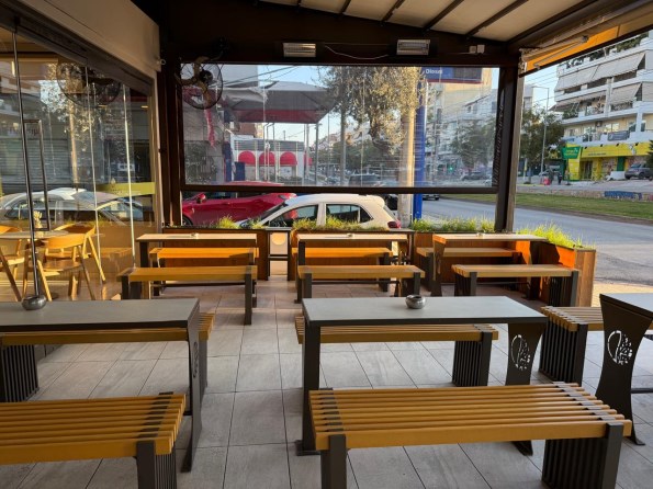 Πρόσφατα ανακαινισμένη καφετέρια, με καινούργια έπιπλα καινούργιες τέντες αέρος και ηλίου και ολοκαίνουργιο σύστημα υδρονέφωσης.