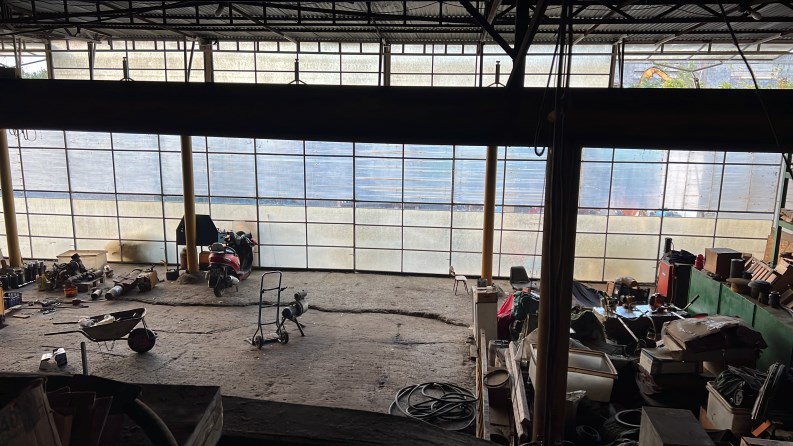 Γερανογέφυρα, πρέσα, δράπανο και πάγκους εργασίας, ράμπα ανύψωσης αυτοκινήτου, οξυγόνα ηλεκτρόλυση και μεγάλη δεξαμενή 1000 λίτρα για κομπρεσέρ αέρα για αεροκλείδα